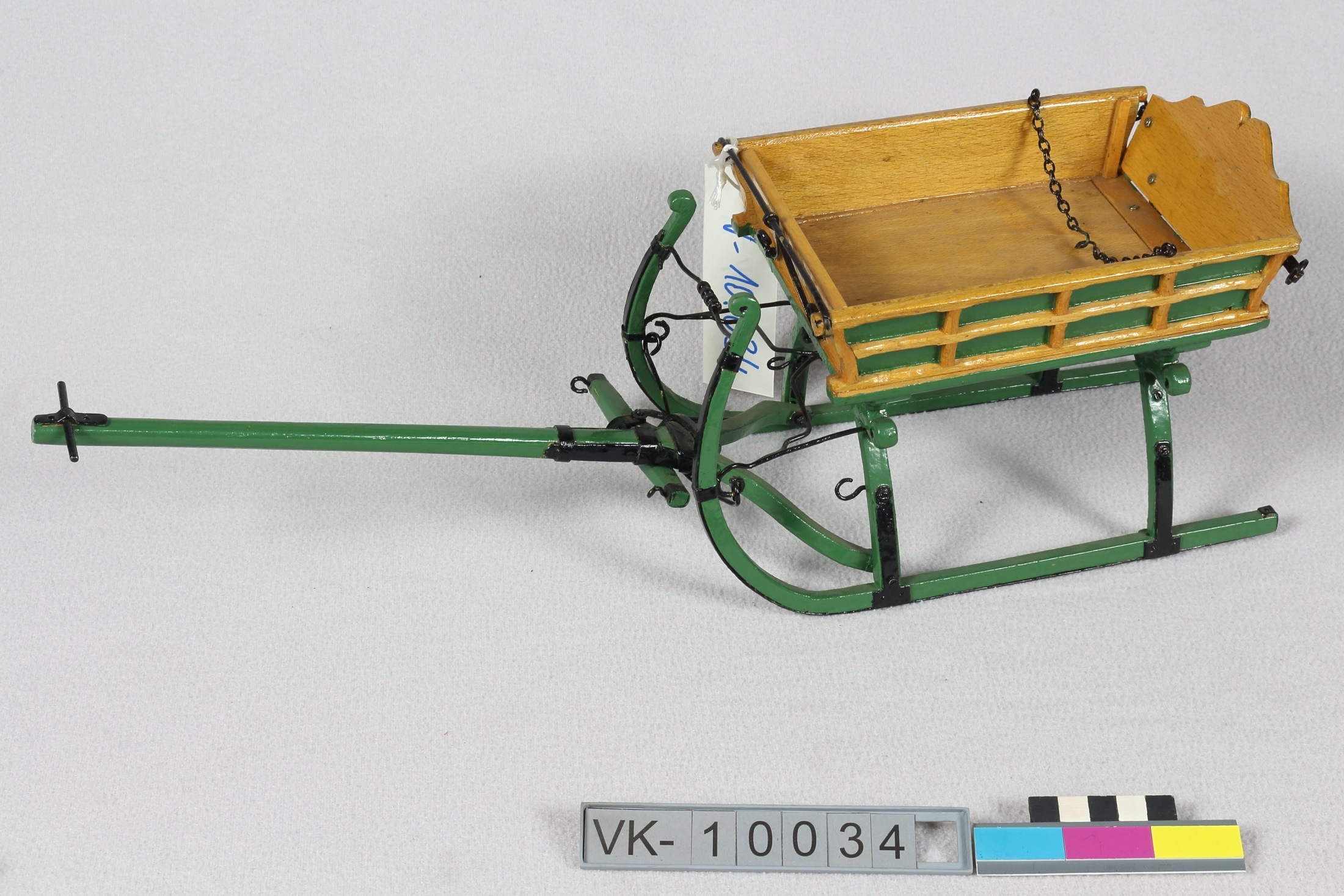 Modell eines Hundeschlittens (laut Inventarbuch 1:20, erscheint aber unwahrscheinlich, eher 1:10) zum Milchtransport. Auf der Heckklappe ist eine Beschriftung: "Samhub 1898".