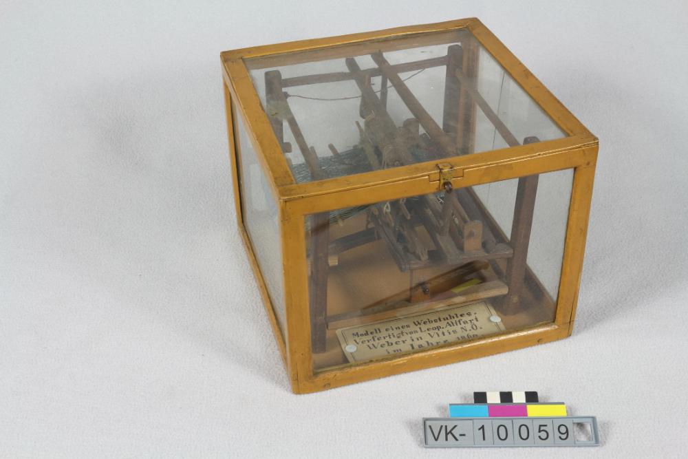 Webstuhlmodell in einem Glaskasten, angefertigt von Leopold Altfart, Weber in Vitis. Das Modell ist funktionstüchtig.