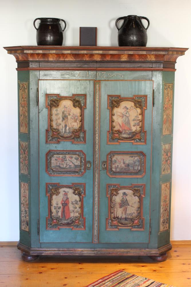 Zweitüriger Kasten mit hellblauem Korpus und sechs gerahmten Feldern auf den Türen, darauf vier Jahreszeiten mit Figuren, dazu zwei Stadtansichten. Auf den Seitenteilen Felder mit Blumengestecken und Büsten, Kranz in Brauntönen, über den Türen eine Datierung: "An 1797".