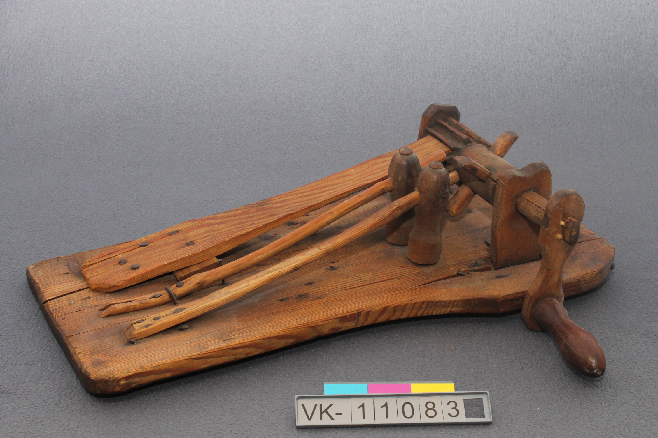 Ratsche mit einem Blatt und zwei Schlägeln auf einem Holzbrett, betrieben mit einer Kurbel über eine Walze mit Zahnrad und einzelnen versetzten Zähnen.