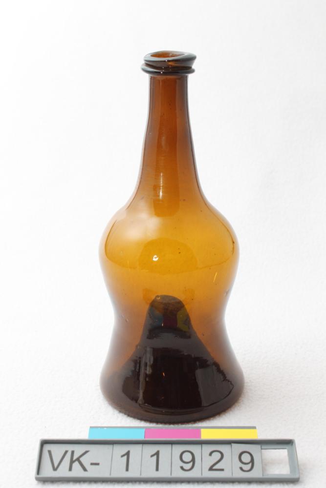 Braune Glasflasche, sanduhrförmig mit konischem Hals und stark eingezogenem Boden.