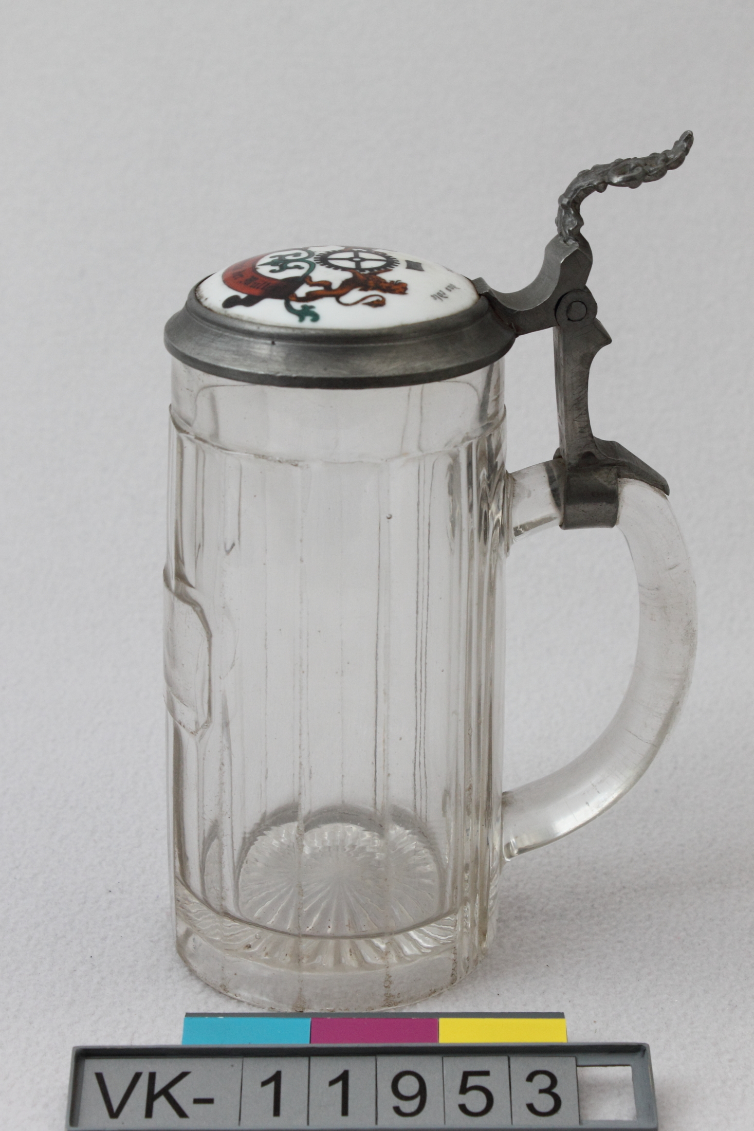 Glaskrügerl mit Zinnmontierung, verziert mit senkrechter Profilierung und einem Schild. Im Zinndeckel ist eine bemalte Porzellanscheibe eingesetzt, das Daumenblatt ist mit einem Palmettenrelief verziert. Auf dem Porzellan ist eine mehrfärbige Bemalung: Zwei Löwen mit Zahnrad und Ornament, dazu Beschriftungen: "Hoch lebe das edle" und "Handwerk der Müller".