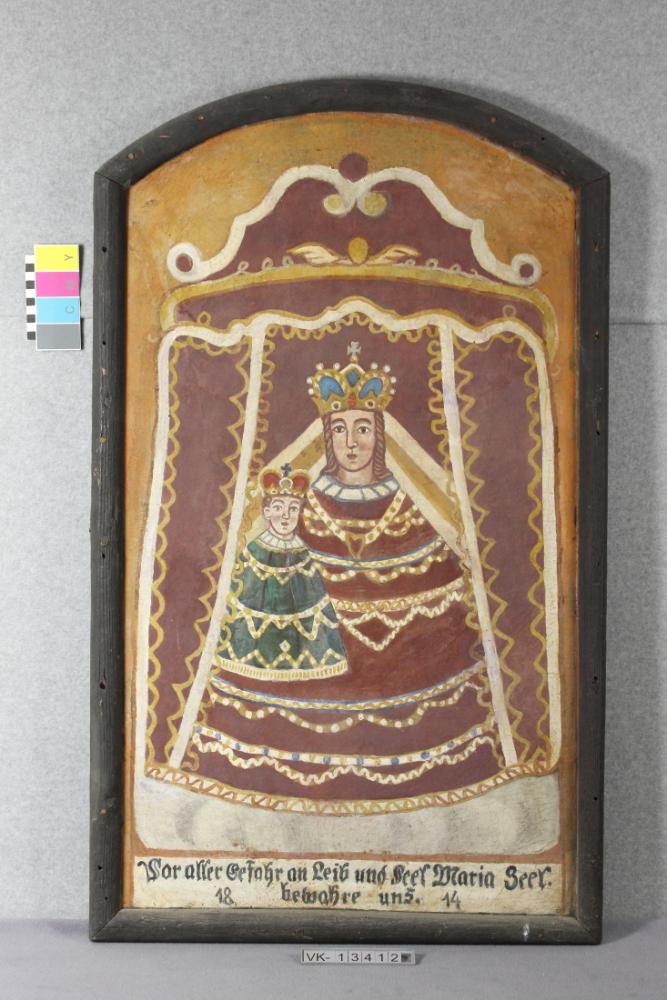 Andachtsbild Mariazell, Tempera auf Karton, in einem schwarzen Holzrahmen, die obere Kante ist gewölbt. Bildunterschrift: "Vor aller Gefahr an Leib und Seel Maria Zeel bewahre uns. 1814".