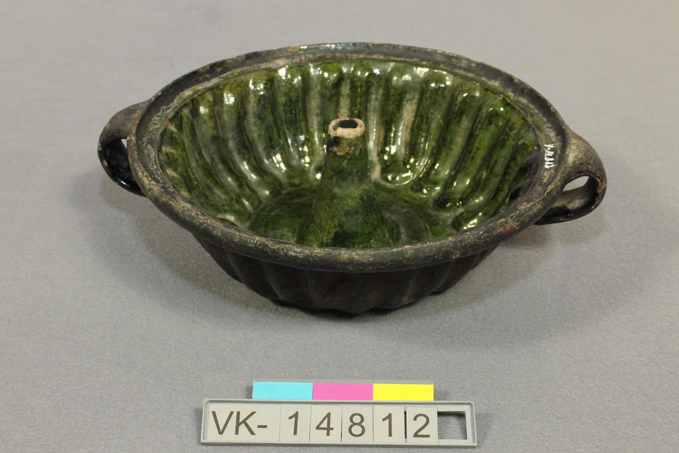 Innen dunkelgrün glasierte, niedrige Gugelhupfform mit zwei Henkeln.