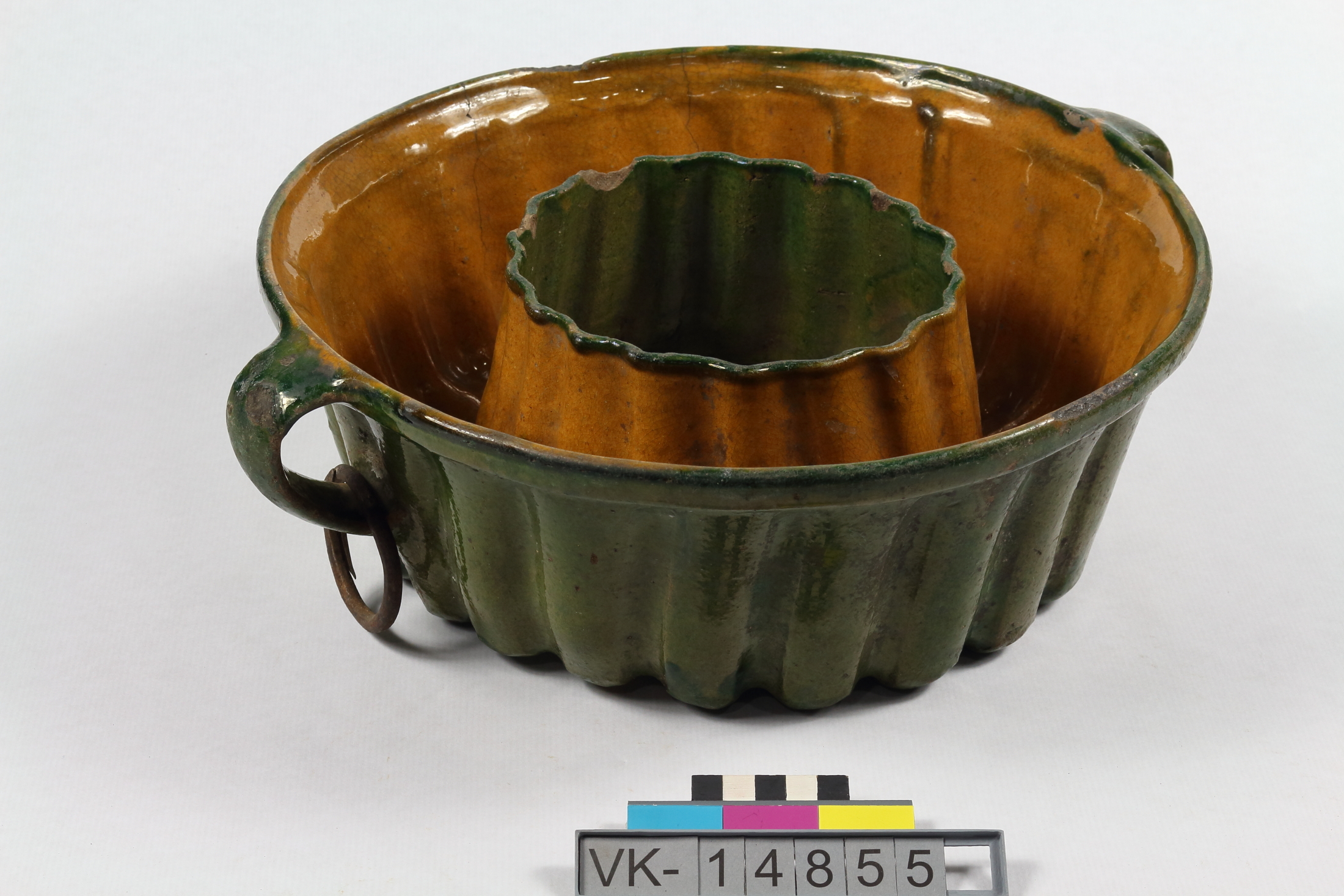 Backform mit profilierter Wandung und einer Öffnung in der Mitte, die Backform hat zwei Handhaben und ist außen dunkelgrün glasiert.