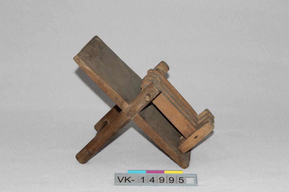 Lärmgerät aus einer Holzplatte mit vier zu beiden Seiten aufzuschlagenden Hämmern und einem Griffelement.