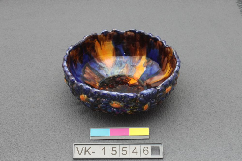 Scheibbser Keramik: Schüssel ("Blumenschale") mit gewölbter Wandung und Standring, die Außenfläche ist als Halbrelief in Blütendekor gestaltet (orange und blau), die Innenseite ist in Laufglasur in orange, blau und braun ausgeführt. Die Schüssel hat eine Pressmarke: "727".