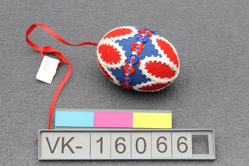 Großes Ei (laut Rechnung Hühnerei), vollflächig beklebt mit Elementen aus blauem und rotem Filz, geometrisch unterteilt durch weiße Spitzenborten, in der Mitte umlaufend eine Borte mit aufgestickten Blütenelementen. Das Ei hat ein rotes Bändchen zum Aufhängen.