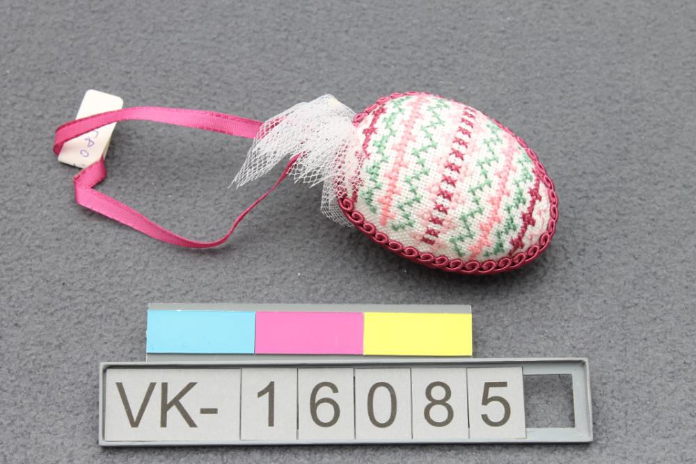 Hühnerei, vollflächig mit weißem Aidastoff bezogen. Das Ei hat eine umlaufende rosa Posamentrieborte, ein rosa Bändchen und eine Bestickung im Kreuzstich mit Musterstreifen in Rosatönen und grün. An der Aufhängung ist ein Stück von weißem Tüllstoff befestigt.