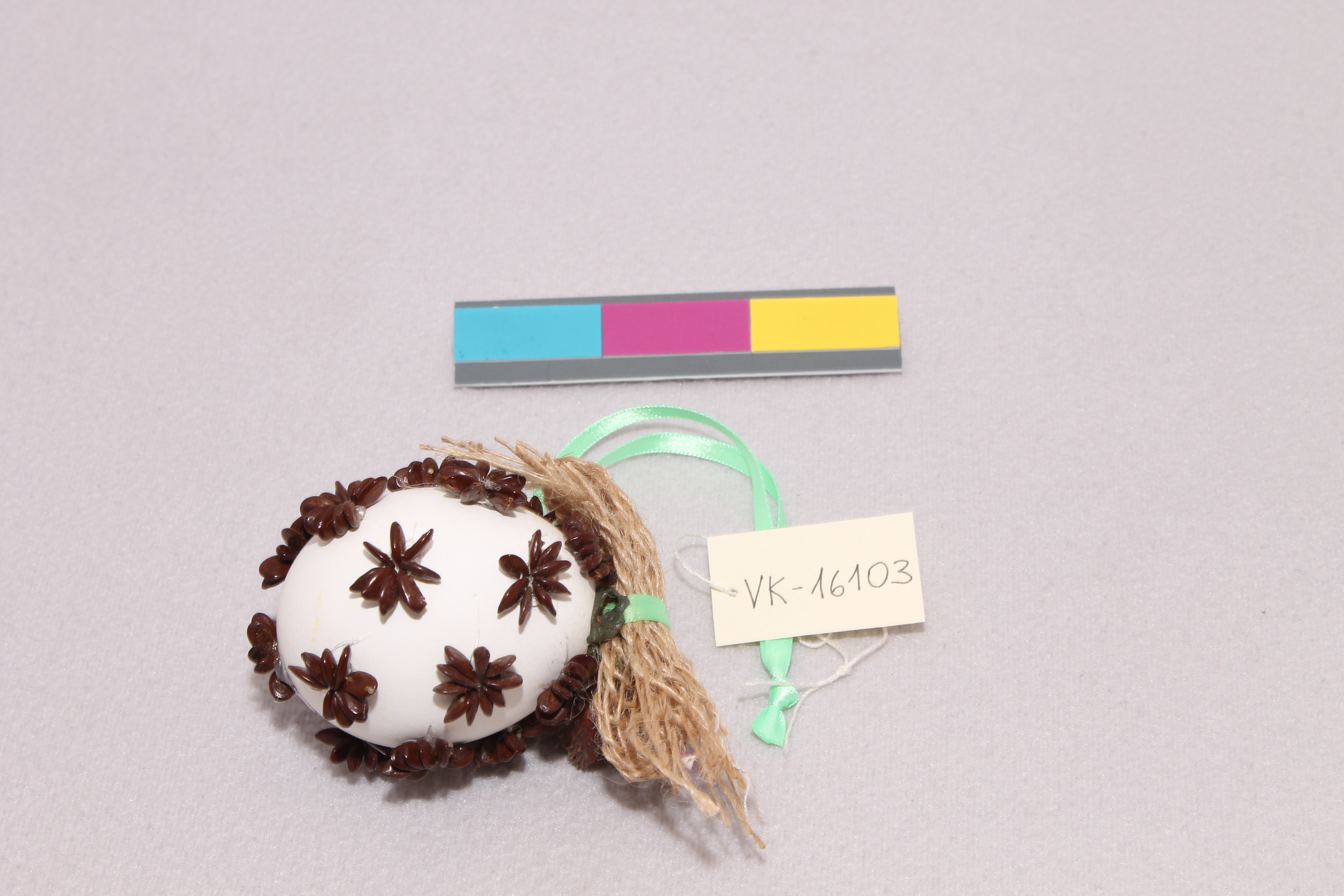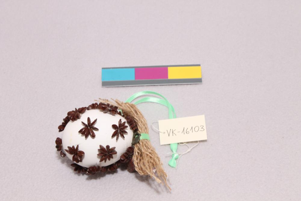 Osterei, ungefärbt weiß, beklebt mit sternförmigen Elementen aus Apfelkernen. Das Ei hat ein grünes Bändchen und ein Bündel Spagat dazu.
