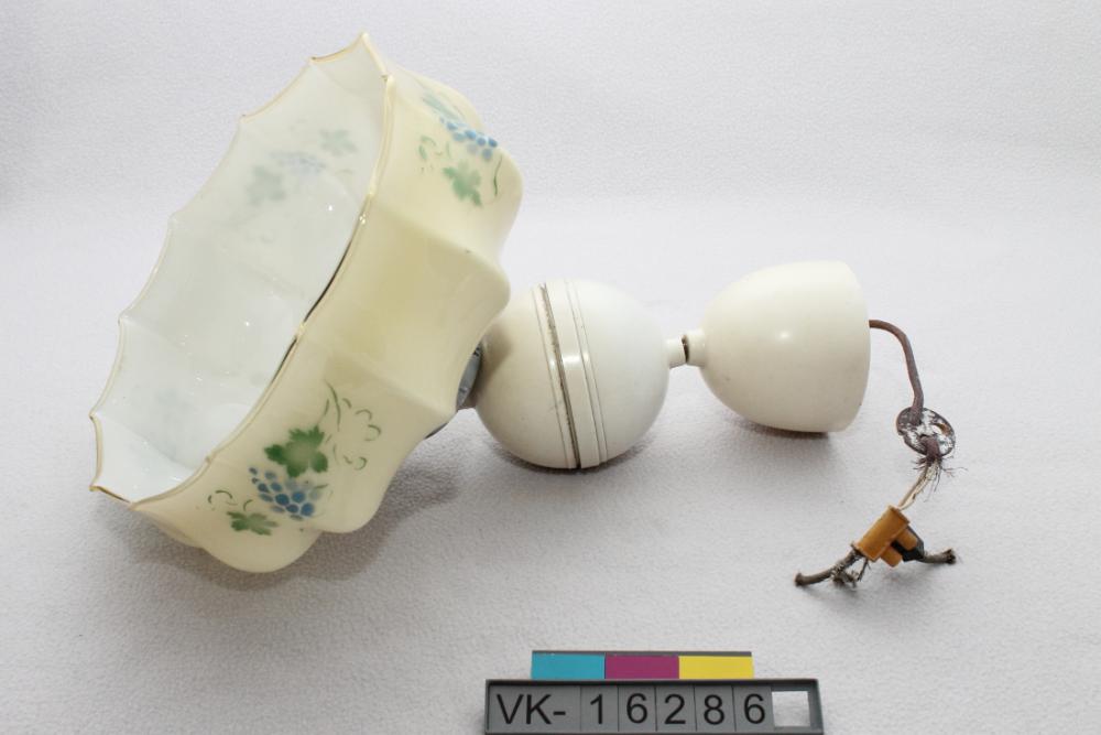 Lampe mit Glasschirm (Schirmform, weiß mit Weintraubendekor in blau und grün) und einem Textilkabel in einem kugeligen Kunststoffaufroller.