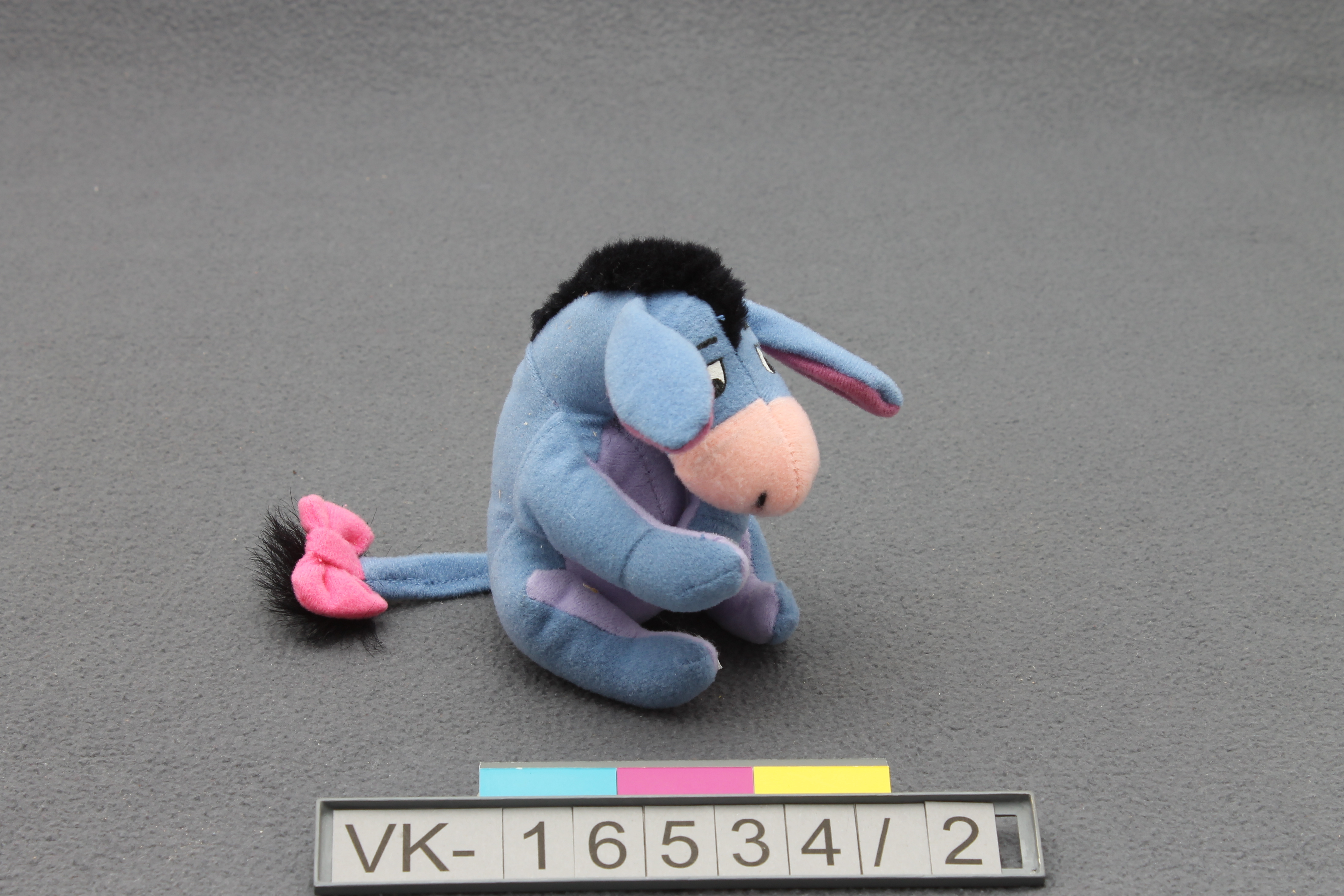 Sitzende Eselfigur "I-Aah" aus der Zeichentrickserie "Winnie Pooh". Das Tier ist blau und violett mit rosa Nase, schwarzer Mähne und einer rosa Schleife am Schwanz.