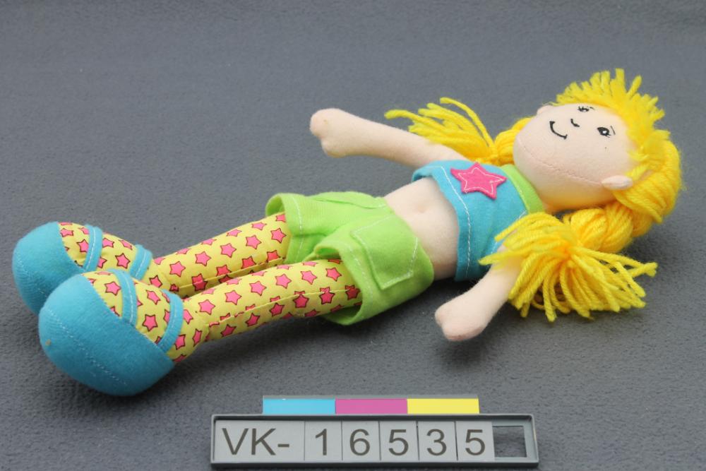 Mädchenpuppe mit gelbem, geflochtenen Wollhaar und Bekleidung: Grüne kurze Hose, gelbe Strumpfhose mit rosa Sternen, blaue Schuhe und ein bauchfreies Oberteil mit einem rosa Stern. Das Gesicht ist aufgedruckt.