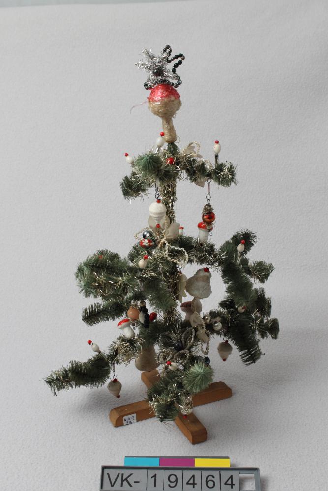 Kleiner Christbaum aus Flaschenbürstenelementen auf einem Holzkreuz, dekoriert mit Glas- und Papiermachéschmuck: Kugeln, Kerzennachbildungen und Fliegenpilze.