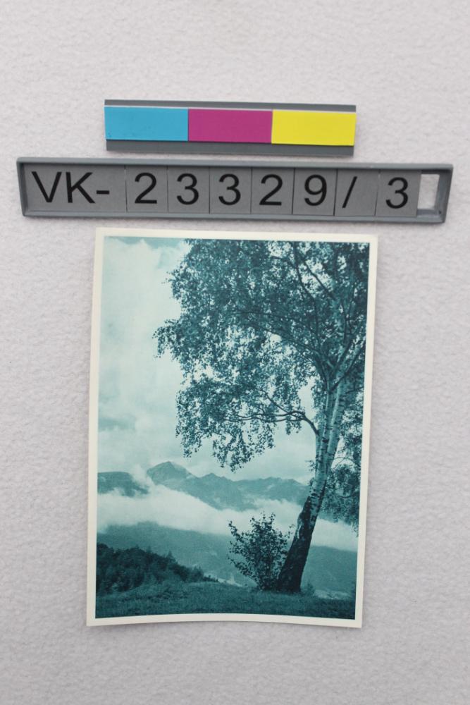Ansichtskarte mit einer einfärbigen Fotografie einer Berglandschaft mit Birke im Vordergrund. Auf der Rückseite eine geteilte Adressseite.