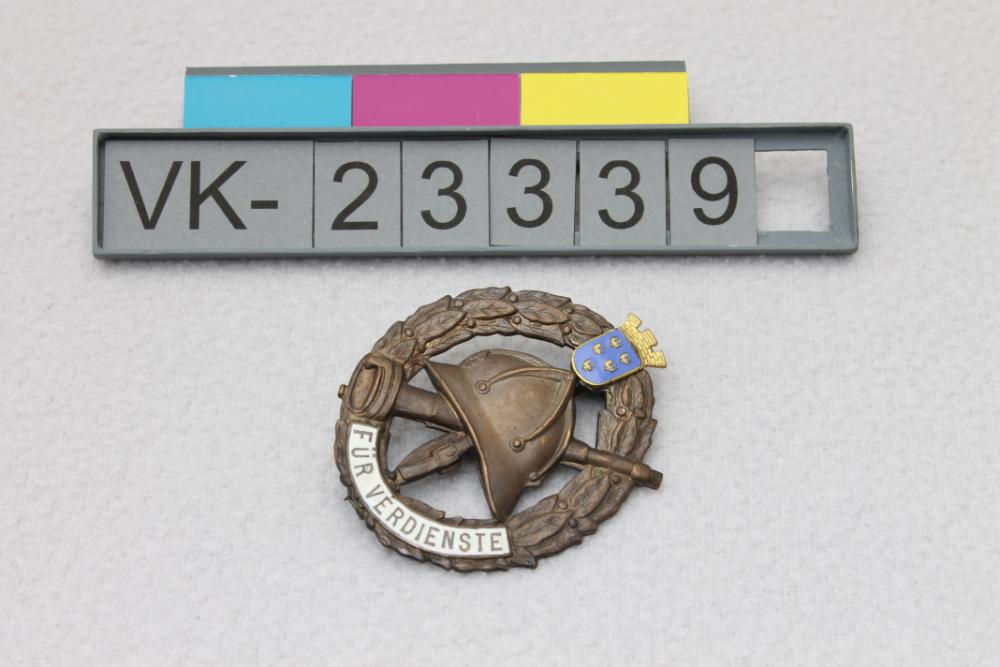 Feuerwehrabzeichen (Verdienstzeichen): Bronzefarbenes Metallabzeichen mit Lorbeerkranz, Helm und Spritze, darauf ein emailliertes NÖ-Wappen und ein emailliertes Schriftband: "FÜR VERDIENSTE".