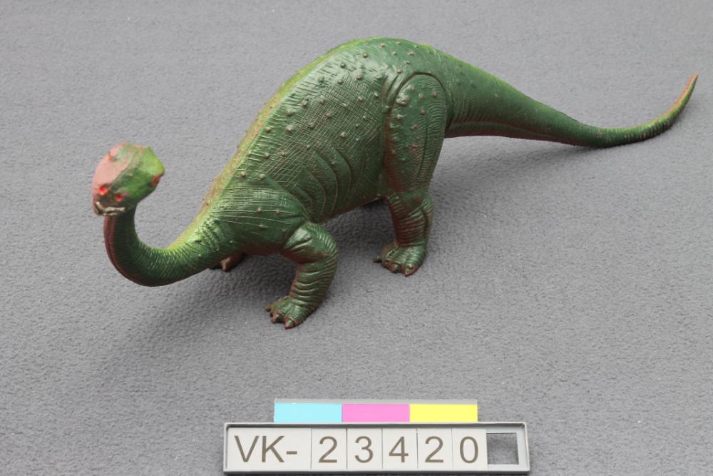 Kunststofftier in braun mit Teillackierung in Grüntönen, Darstellung eines Dinosauriers mit langem Hals und langem Schwanz, der Kopf und das Maul sind von einer naturalistischen Darstellung abweichend raubtierartig gestaltet. Auf dem Boden eine eingegossene Beschriftung: "1986 OOR WEI MADE IN CHINA PRONTOSAURUS" (gemeint ist Dor Mei).