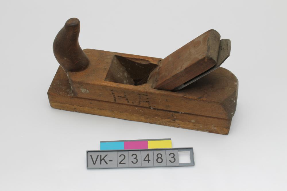 Hobel aus Holz mit geschwungener Hobelnase und einem Hobeleisen mit Verstellschraube und Keilwiderlager. Der Hobel hat eine eingeprägte Beschriftung: "JOH. WEISS & SOHN WIEN". An einer Seite sind eingeschlagene Initialen: "H. A.". Das Objekt wurde wegen starkem Schimmelbefall ausgesondert und befindet sich nun in einer Schimmelkiste.