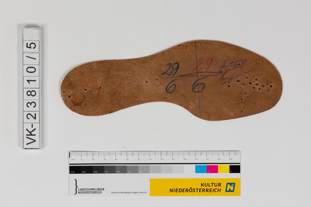 Sohlenform aus Karton mit handschriftlicher Beschriftung: "29/6", etc.