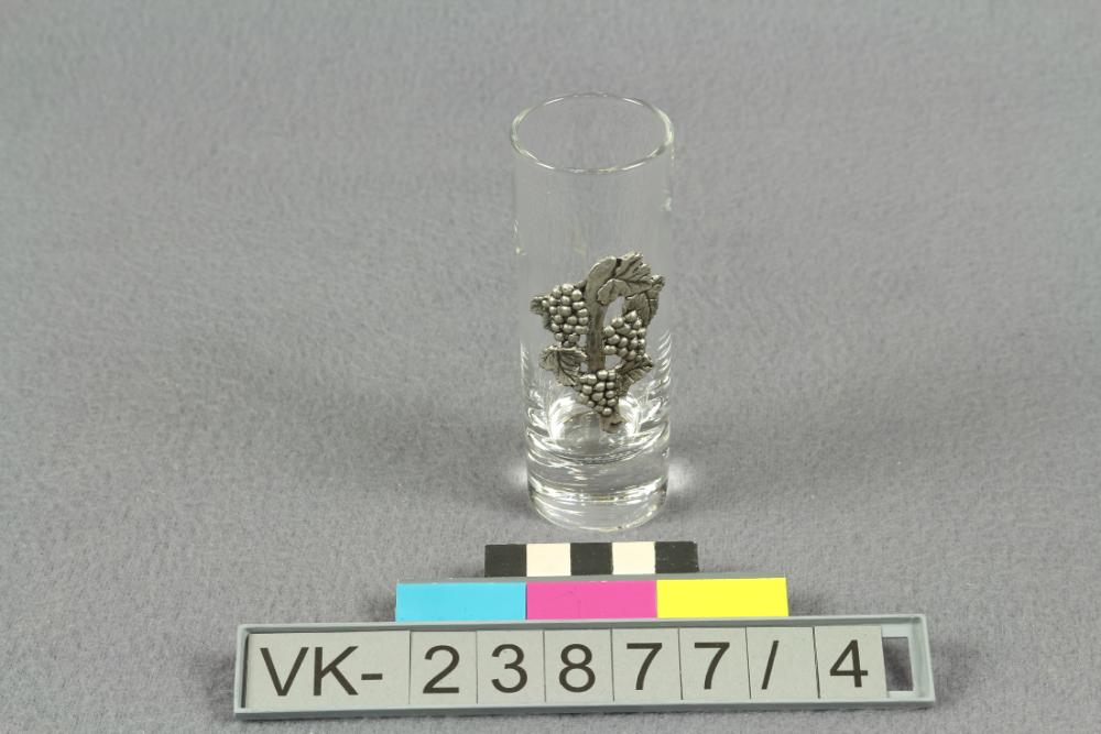 Zylindrisches Schnapsglas mit starkem Boden. Das Glas hat ein aufgeklebtes Zierelement aus Zinn: Weinstock mit Trauben.