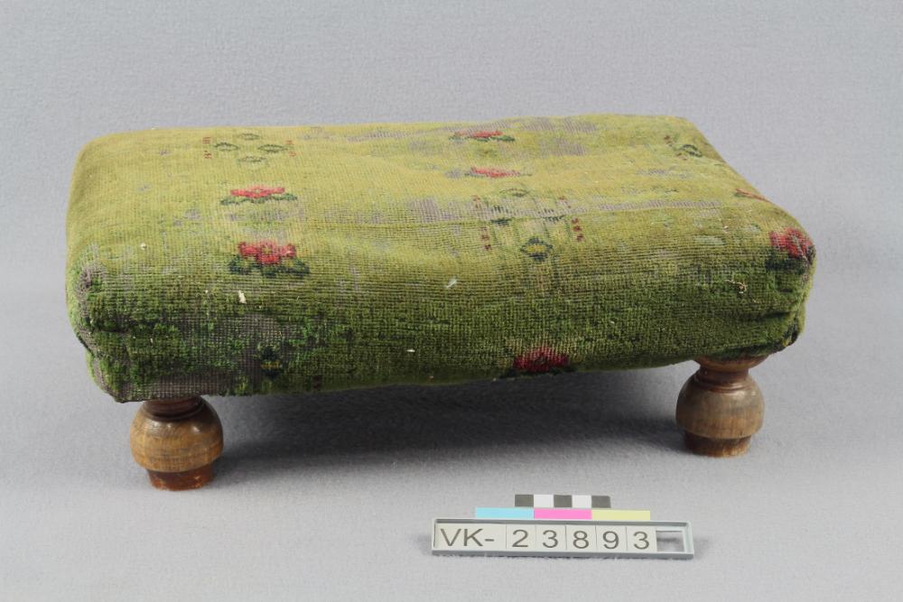 Vierfüßiger Schemel (bzw. Fußstütze), bezogen mit grünem rotgeblümtem Samt.