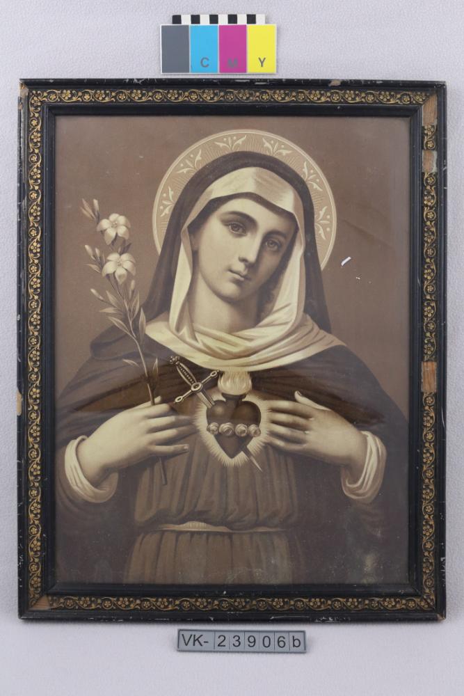 Herz-Mariae-Bild in Sepiatönen hinter Glas in einem schwarzen Holzrahmen mit Goldzier.