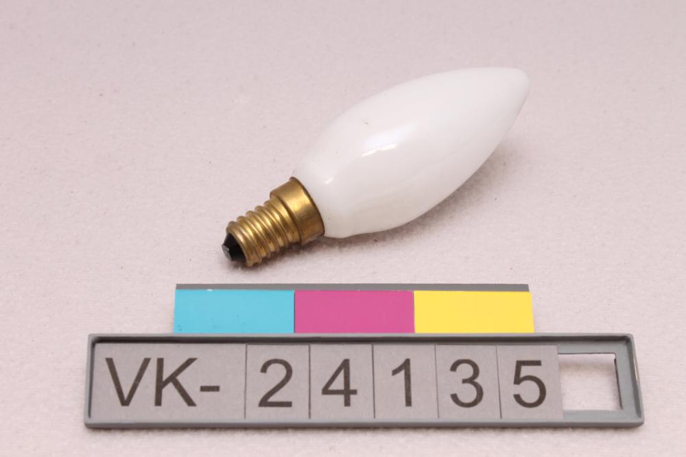 Glühbirne in Kerzenform mit Schraubsockel, Milchglas mit Beschriftung: "LINDNER 40 Watt".