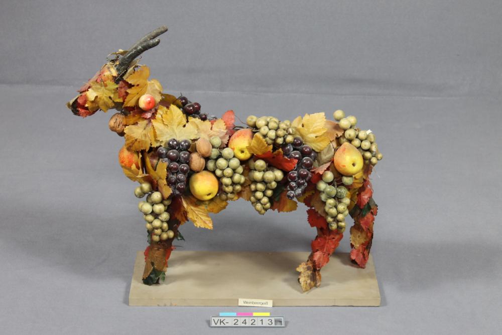 Weinbeergeiß mit Holzgerüst auf einem Sockel, behängt und umwickelt mit Weinlaub und Weintrauben aus Kunststoff, dazu Kunststoffäpfel und Nüsse.