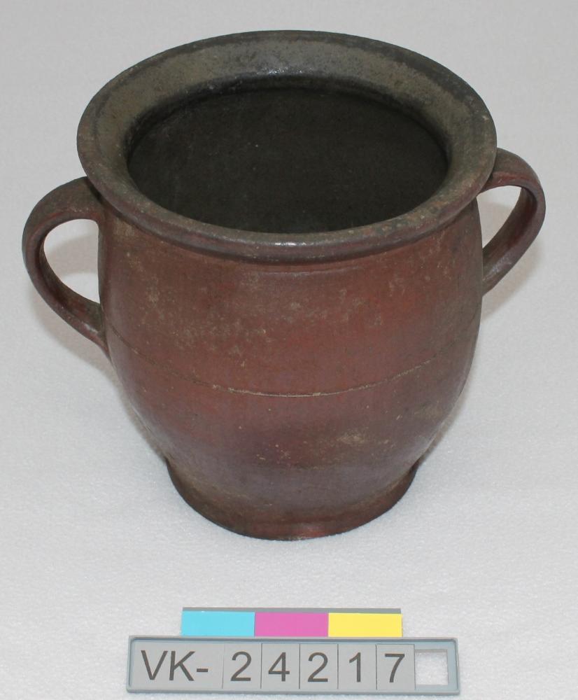Weinroter, leicht bauchiger Topf mit weiter Öffnung und zwei schulterständigen Henkeln.