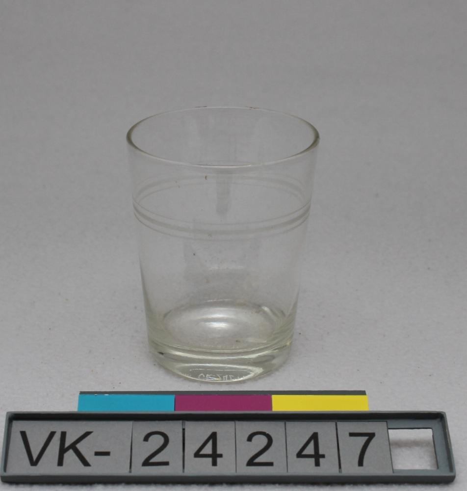 Leicht konisches Glas mit drei umlaufenden Zierlinien.