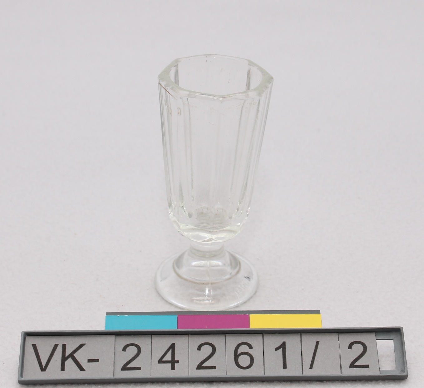 Leicht konisches, achteckig profiliertes Schnapsglas mit abgesetztem Fuß. Das Schnapsglas hat einen gravierten Eichstrich und eine eingegossene Maßzahl: "1/20".
