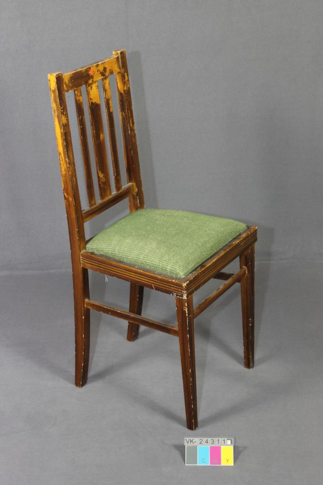 Sessel (VK-24311a) aus dunklem Holz, die Lehne hat drei vertikale und zwei horizontale Verstrebungen, die Füße sind durch Streben verbunden. Die Sitzfläche (VK-24311b) ist trapezförmig, gepolstert und mit grünem Cordstoff bezogen.
