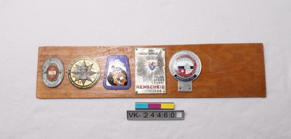Sperrholzbrett mit fünf Plaketten; vier Plaketten sind von Polizeisternfahrten 1952 (ohne Ortsangabe), 1954 (München), 1960 (Garmisch-Partenkirchen) und 1963 (Remscheid), eine von einer vergleichbaren auf Englisch bezeichneten Veranstaltung 1965 (Thun, ausgerichtet vom BMC).