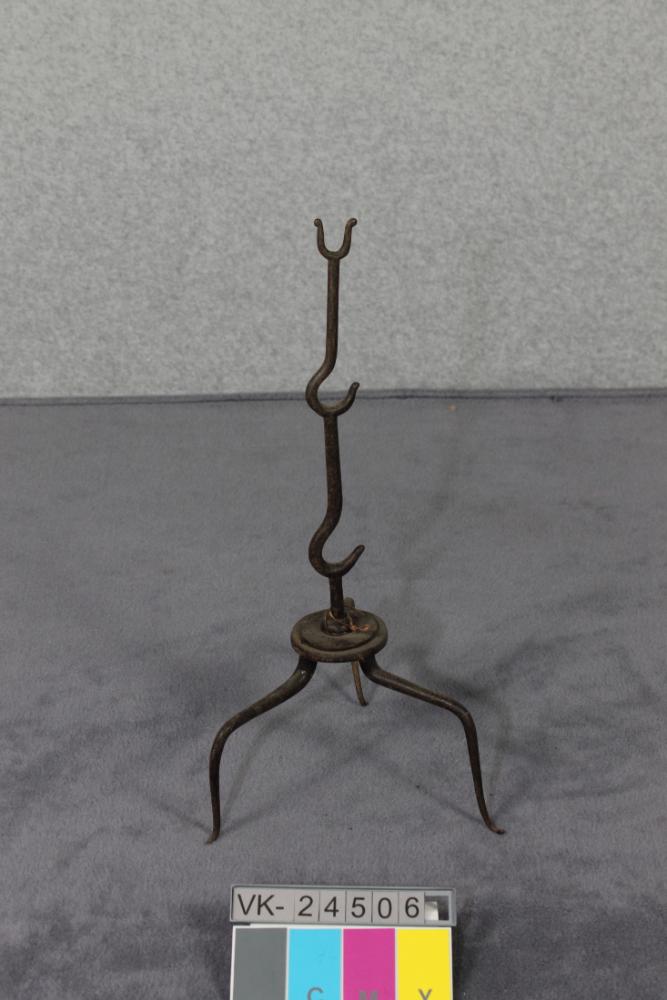 Dreifüßiger Feuerbock (Feuerhund) mit einer senkrechten Strebe, daran zwei seitliche Haken und ein Doppelhaken am Ende.