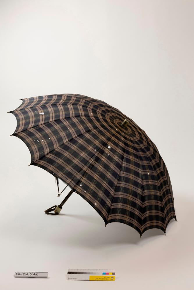 Regenschirm mit schwarz-beige karierter Bespannung und Holzstock, Zwinge und Griff sind aus weißem Kunststoff.