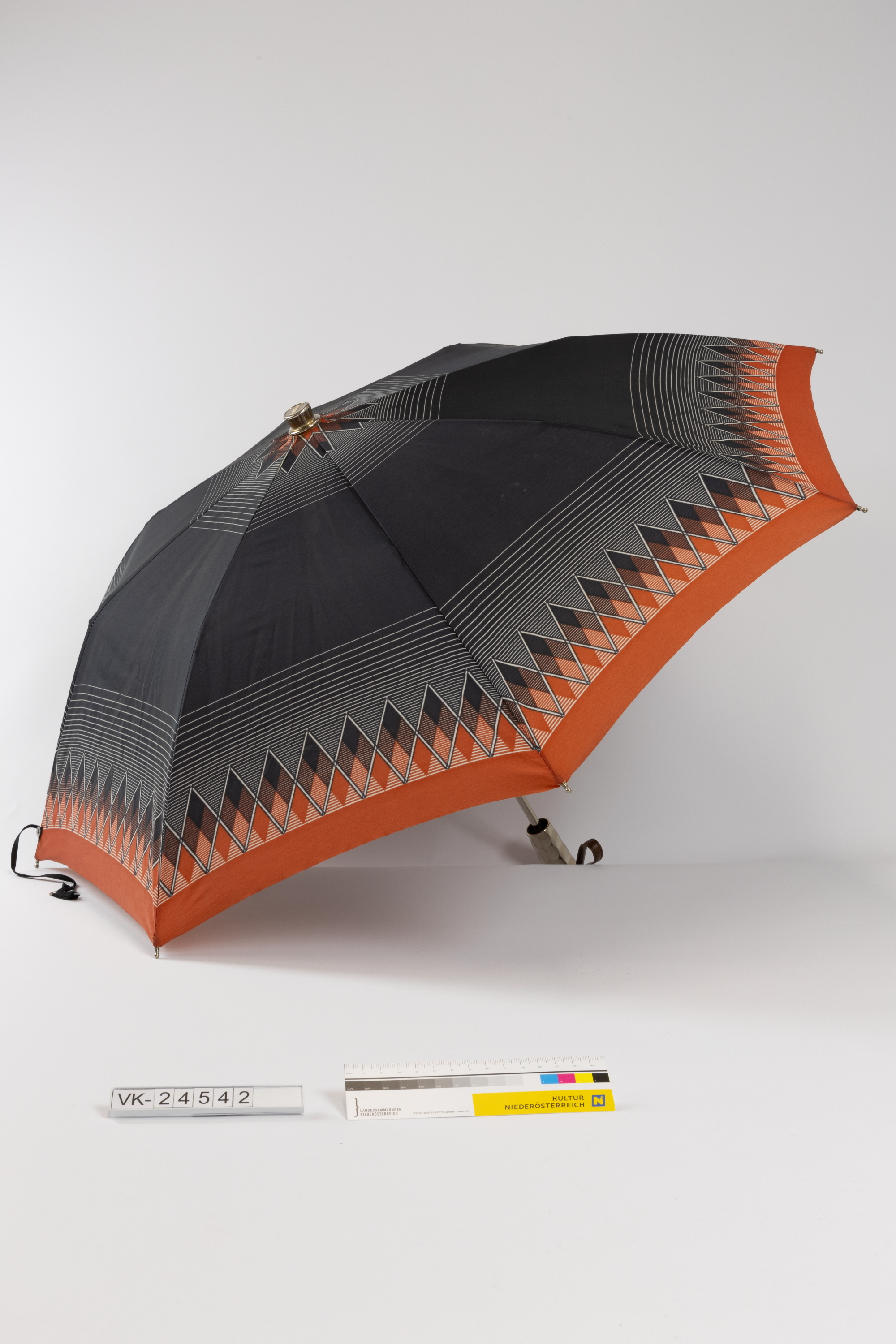 Taschenschirm mit Metallgestänge, silbernem Griff und einer schwarz-roten Bespannung mit einem Rautenmusterstreifen.