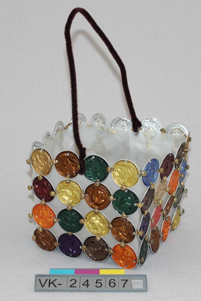 Kubische Laterne, hergestellt aus Transparentpapier mit darauf befestigten restentleerten und flach gedrückten Kaffeekapseln eines Kapselsystems ("Nespresso"). Die Kapseln sind in verschiedenen Farben vorhanden; innen hat die Laterne einen Kartonboden und eine Teelichtkerze, als Tragevorrichtung dient ein schwarzer Pfeifenputzer als Henkel.