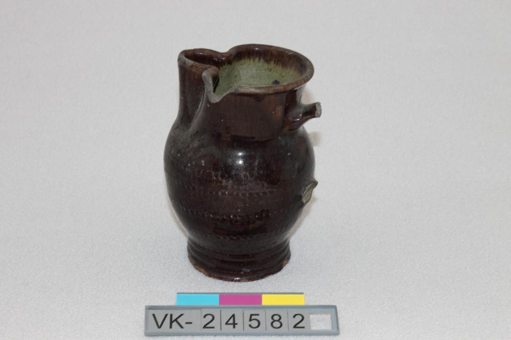 Bauchige Kanne (Mostkrug) mit Kleeblattmündung und abgesetzter Fußzone, braun glasiert. Die Kanne hat einen Henkel und ist im Bauchbereich verziert.
