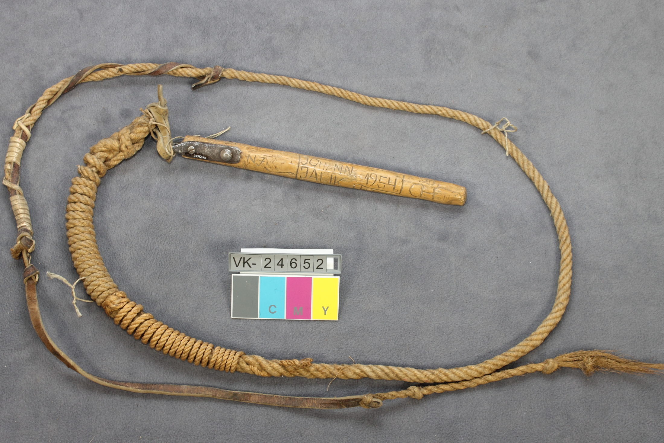 Peitsche (Gerte) mit Holzgriff, daran ein Seil mit Lederelementen. Der Griff ist mit mehreren Beschriftungen beschnitzt: "JOHANN JALIK 1954", "NZ", "LUDWIG", "NEUSTIFTER" und weitere Beschriftungen.
