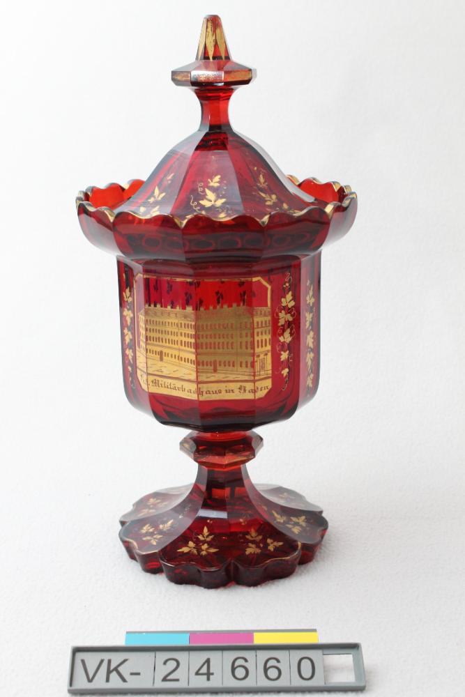 Glas (VK-24660a) mit Deckel (VK-24660b). Das kelchartige Glas ist mehreckig profiliert, hat einen Stiel mit Wulst und einen Fuß; der Rand ist zu einer verbreiterten Aufnahme für den Deckel geformt. Der Deckel ist annähernd konisch und nach oben zu einer Spitze mit Wulstelement verlängert. Das Objekt besteht aus rotem Kristallglas und ist umlaufend goldverziert, floral und dazu eine Ansicht des Militärbackhauses in Baden.