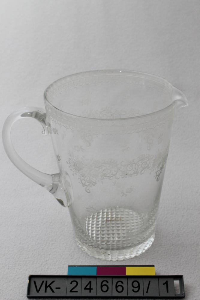 Kanne mit Henkel und kleinem Schnabel, mit Gravur: Ornamentale Muster über die Wandung verteilt, am Rand eine umlaufende Musterborte. Der Boden ist mit einer Gitterstruktur geschliffen. Die Kanne hat ein sehr kleines graviertes Monogramm: "KB".