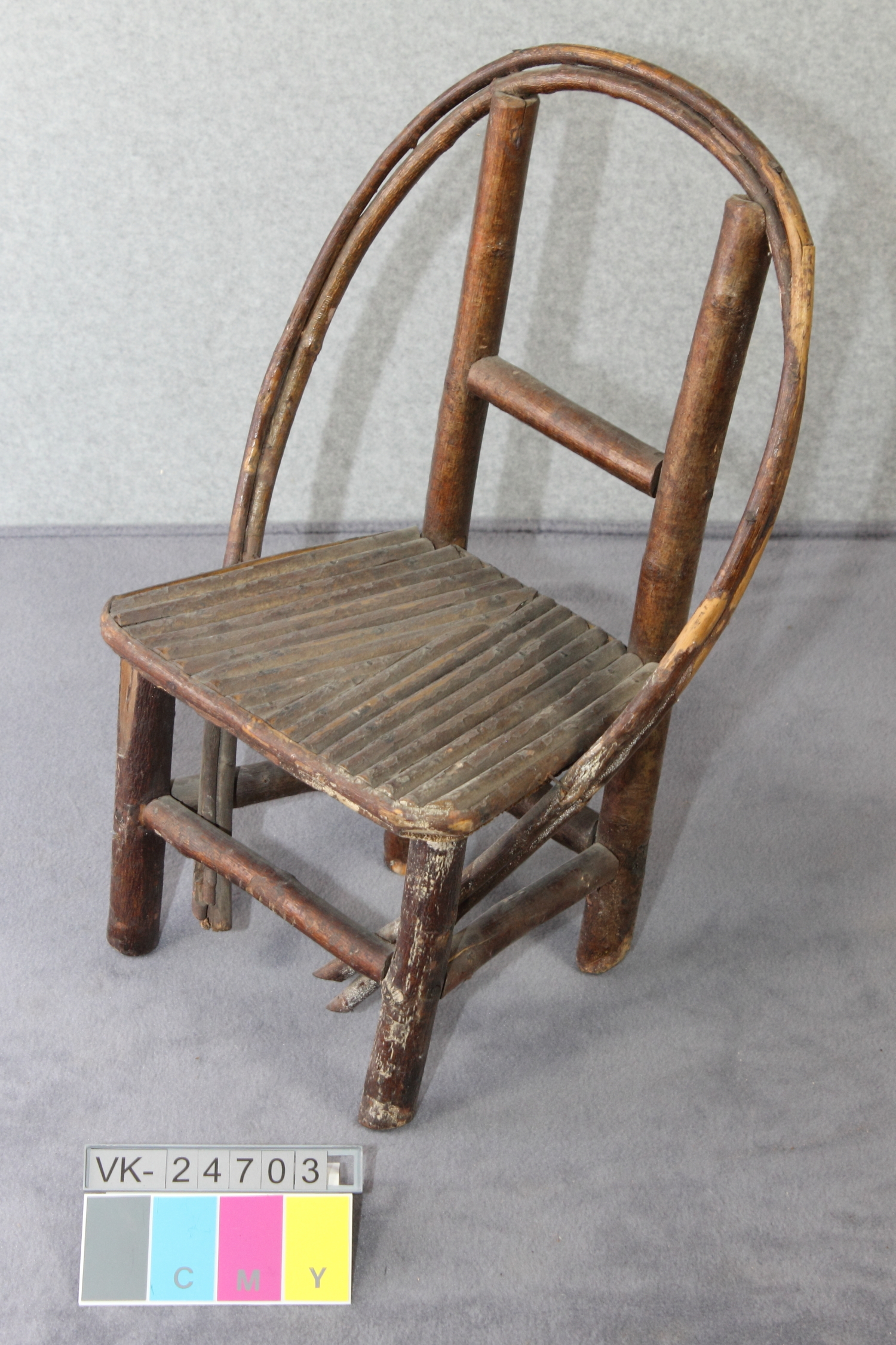 Kindersessel mit trapezförmiger Sitzfläche und einer H-förmigen Lehne, die mit einem geschwungen verlaufenden Armlehnenelement verbunden ist. Der Sessel ist aus nicht entrindeten Ästen gefertigt.