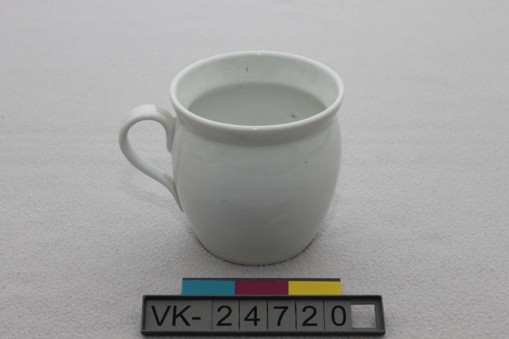 Bauchiger weißer Topf mit ausgestelltem Rand und einem schulterständigen Henkel.