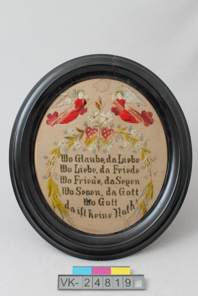 Haussegen in einem ovalen schwarzen Holzrahmen, gestickt auf gelochtem Papier mit aufgeklebten Papierelementen (Köpfe der Engel). Spruch: "Wo Glaube da Liebe.." etc. Das Objekt befindet sich auf dem Restaurierungstisch.