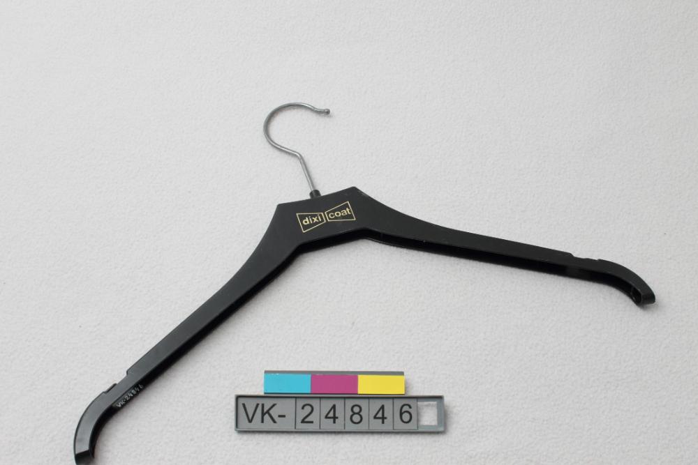 Schwarzeer Kunststoffkleiderbügel mit Rockhaken und einer goldfarbenen Beschriftung: "dixi coat".
