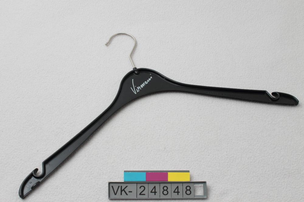 Schwarzer Kunststoffkleiderbügel mit Rockhaken und weißem Aufdruck: "Virmani". Der Kleiderbügel hat ein eingegossenes Markenzeichen: "coronet".