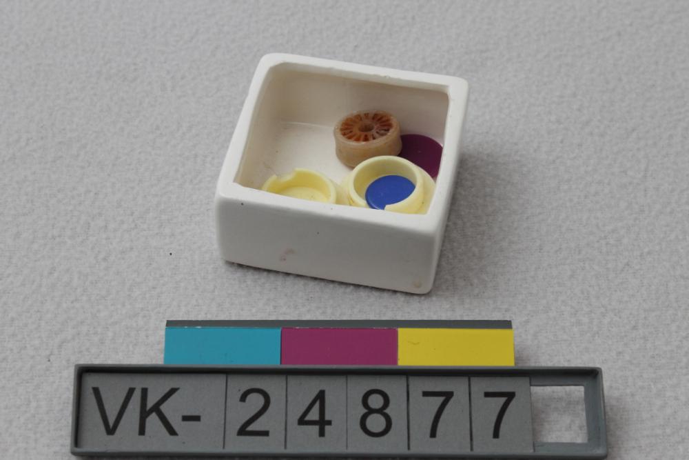 Schüssel mit Kleinteilen. Die Schüssel ist aus weißer Keramik, quadratisch, und enthält zwei Verschlusstopfen, zwei Spielchips und einen Strahlregler von einem Wasserhahn. Das Objekt befindet sich in der Schatulle mit der Inventarnummer VK-24881.