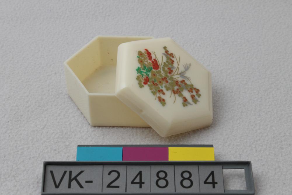 Sechseckige Schatulle (VK-24884a) mit Deckel (VK-24884b), aus weißem Kunststoff. Auf dem Deckel ist ein chinesisch anmutendes florales Motiv aufgedruckt. Das Objekt befindet sich in der Schatulle mit der Inventarnummer VK-24881.