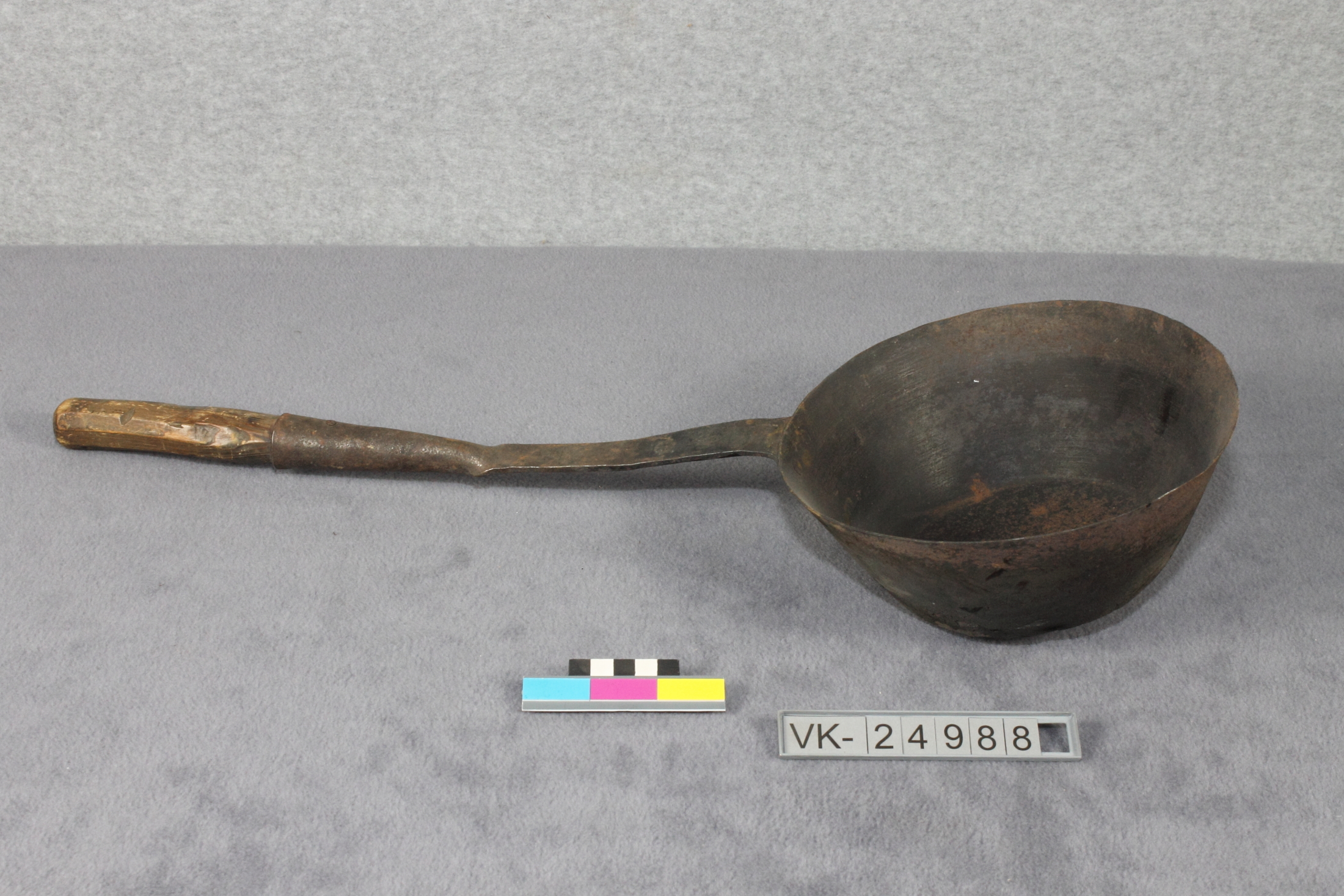 Tiefe trichterförmige Pfanne mit Stiel und Holzgriff in einer Tülle. Am Stiel ist eine sternförmige Punzierung.