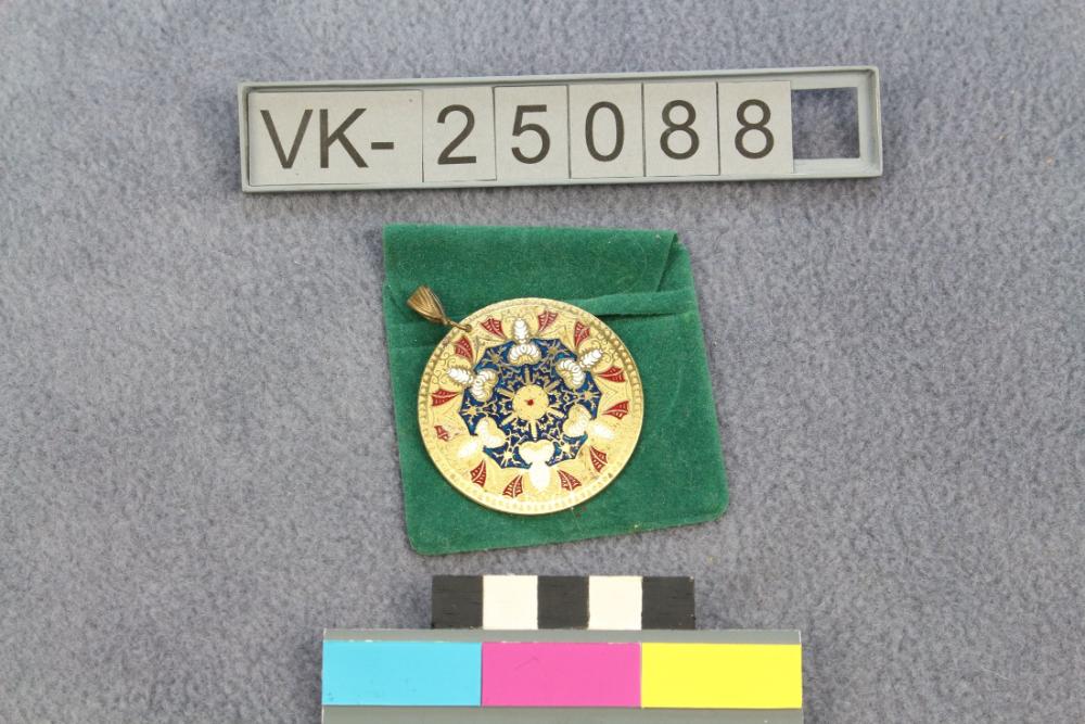 Runder goldfarbener Anhänger mir ornamentaler Emaillierung in weiß, rot und blau. Der Anhänger ist in einem grün beflockten Briefchen aufbewahrt. Das Objekt befindet sich in der Schatulle mit der Inventarnummer VK-24882.
